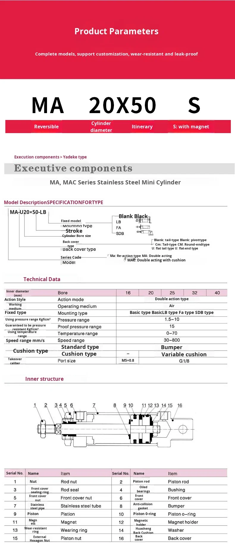 | Action Mode | Double-acting / Single-acting | Double-acting: MA/MAD/MAJ/MAC; Single-acting: MSA/MTA | MA is the basic double-acting model; MAC is equipped with adjustable cushioning |